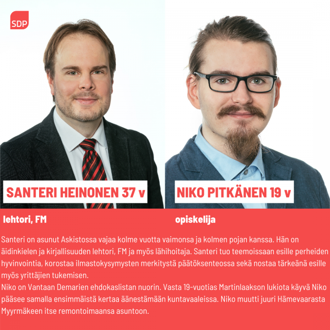 Kuntavaaliehdokkaittemme esittelyt jatkuvat: Vaalien ensikertalaisia ovat koulujen arjessa toimivat Hämeenkylän lehtori Santeri Heinonen ja Martinlaakson lukiossa opiskeleva Niko Pitkänen.